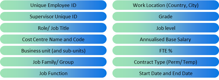 In line with data privacy regulations, Simply Navigate is designed to utilise only the minimum required data for the specified purpose agreed with a customer during onboarding. As such, exact specifications may differ. A typical data feed from a customer's source HR system contains the following fields related to the workforce and roles: