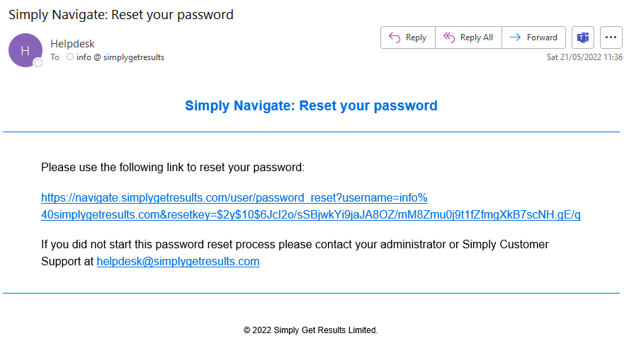 This will generate a password reset email from 'helpdesk@simplygetresults.com'